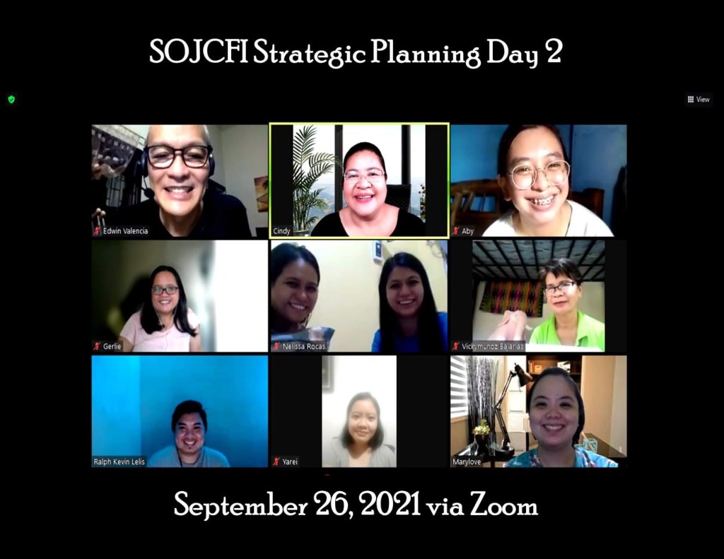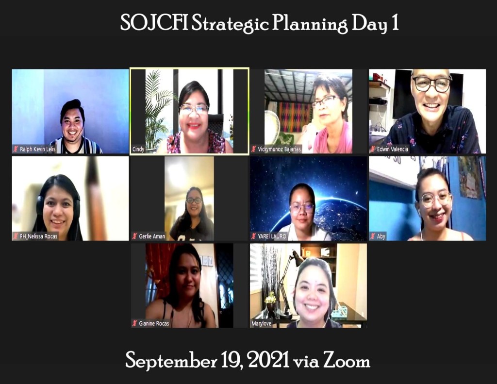 The SOJCFI Board of Trustees (BOT) conducted its Strategic Planning for 2022-2026 last September 19 & 26, 2021 via Zoom application. It was facilitated by Edwin Valencia, also a member, incorporator and former BOT member of SOJCFI.